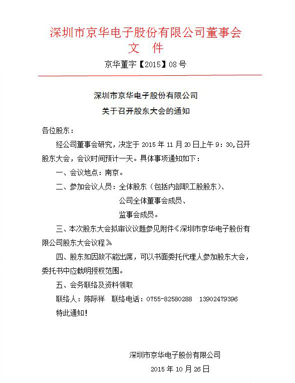 深圳市京華電子股份有限公司關于召開股東大會的通知