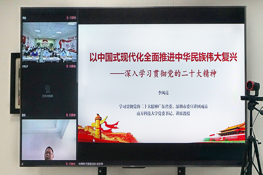 會議邀請了學(xué)習(xí)貫徹黨的二十大精神廣東省委宣講團成員、南方科技大學(xué)黨委書記李鳳亮教授作《以中國式現(xiàn)代化全面推進(jìn)中華民族偉大復(fù)興——深入學(xué)習(xí)貫徹黨的二十大精神》報告。李鳳亮教授從認(rèn)真學(xué)習(xí)領(lǐng)會黨的二十大的主題及其重大意義,準(zhǔn)確把握大會確定的重要思想、重要觀點、重大戰(zhàn)略、重大舉措,深刻認(rèn)識當(dāng)前的機遇與挑戰(zhàn),以及為中國式現(xiàn)代化作出廣東貢獻(xiàn)、體現(xiàn)深圳擔(dān)當(dāng)?shù)人膫€方面,對黨的二十大精神進(jìn)行了深入解讀、深刻闡釋和權(quán)威輔導(dǎo)。