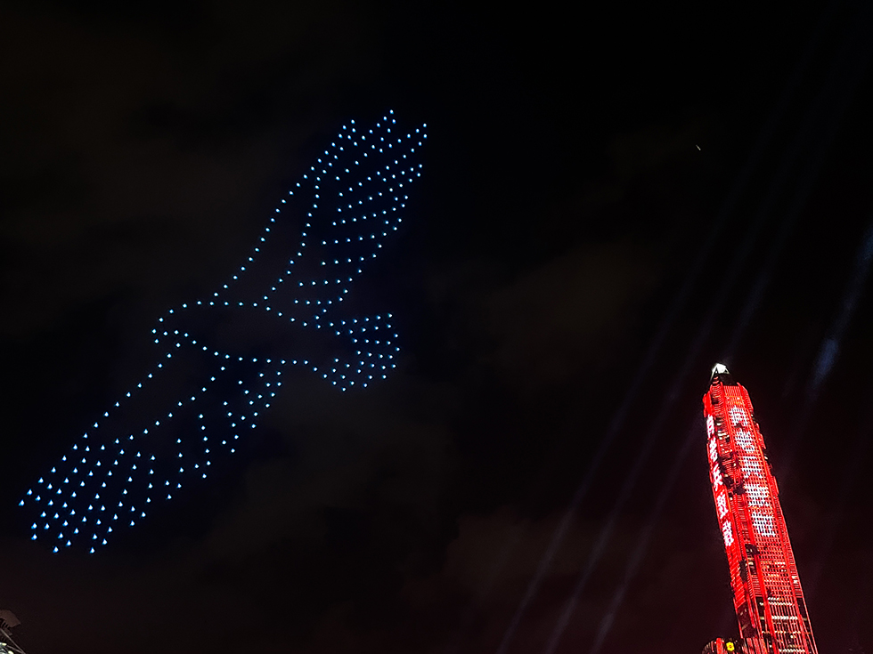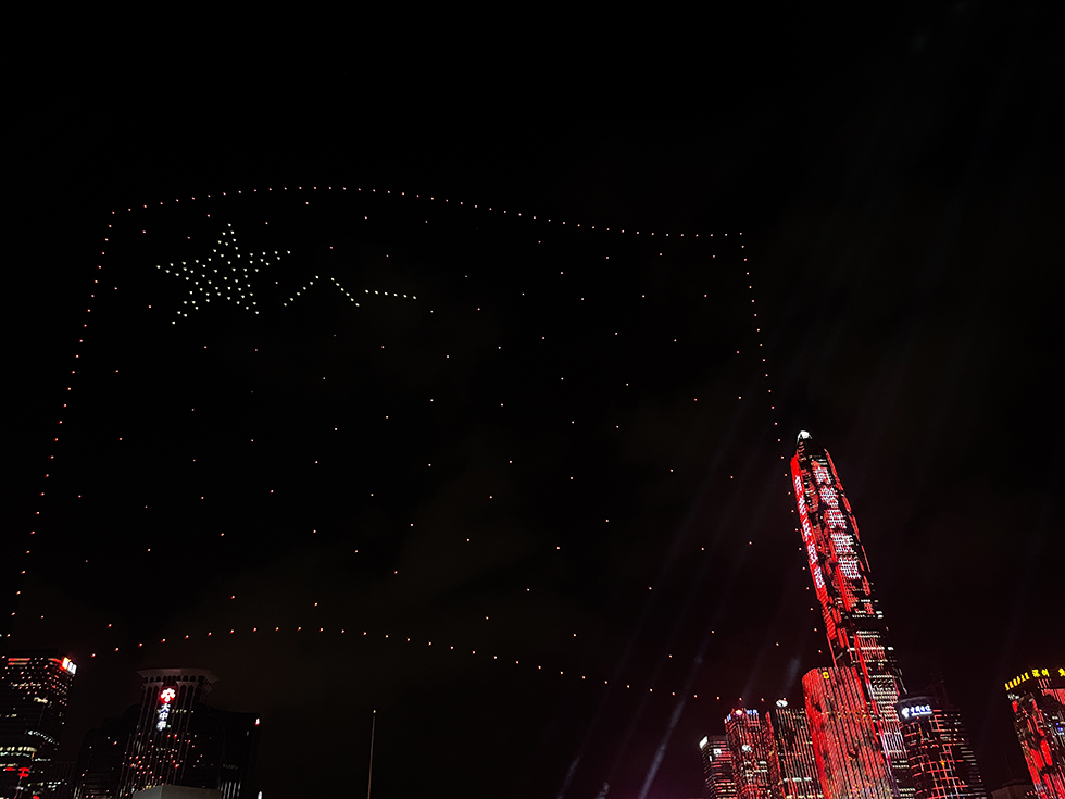 夜幕降臨,軍號響起,儀仗兵向老兵致敬。市民中心廣場周邊的樓宇建筑瞬間被耀眼奪目的燈光點(diǎn)亮,“老兵你好”“向老兵致敬”等宣傳標(biāo)語映紅天際。千部無人機(jī)騰空而起,在夜空中靈動飛舞,先后編排出改革開放45周年、大鵬展翅、軍號、八一軍旗等造型畫面與市民中心廣場絢麗的舞臺交相輝映。參加節(jié)目錄制的老兵們身著戎裝,與市民群眾共賞這場光影盛宴。