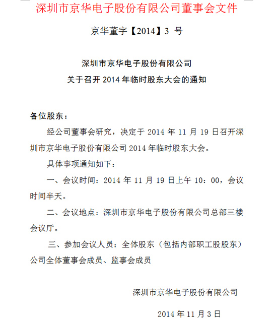 深圳市京華電子股份有限公司關于召開2014年臨時股東大會的通知